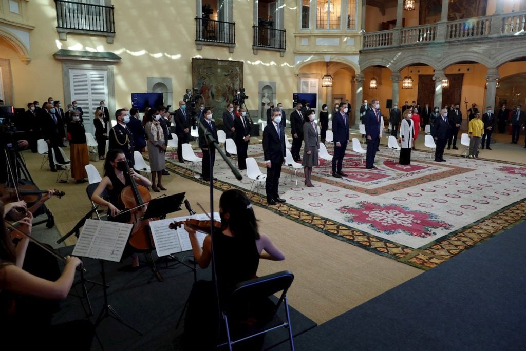 El presidente del CGPJ Carlos Lesmes (i), la presidenta del Senado Pilar Llop (2i), el presidente del Gobierno, Pedro Sánchez (3i), el Rey Felipe VI (c), la presidenta del Congreso de los Diputados Meritxell Batet (3d), el presidente del Tribunal Constitucional Juan José González Rivas (2d), y la ministra de Asuntos Exteriores Arantxa González Laya (d), esta mañana en el Palacio de El Pardo en Madrid, para conmemorar el 75 aniversario de la fundación de la Organización de Naciones Unidas (ONU).- EFE/J.J. Guillén POOL