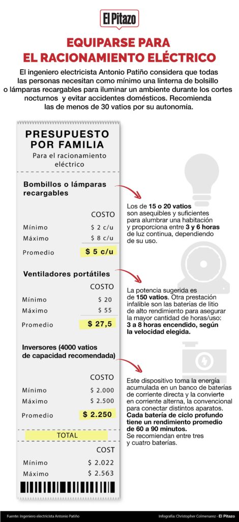 La calidad del producto y el tiempo de duración está asociado al costo. El ingeniero electricista Antonio Patiño considera que todas las personas necesitan una linterna de bolsillo o lámparas recargables para iluminar, por lo mínimo, un ambiente durante los cortes nocturnos y evitar accidentes domésticos. Recomienda las de menos de 30 vatios por su autonomía.